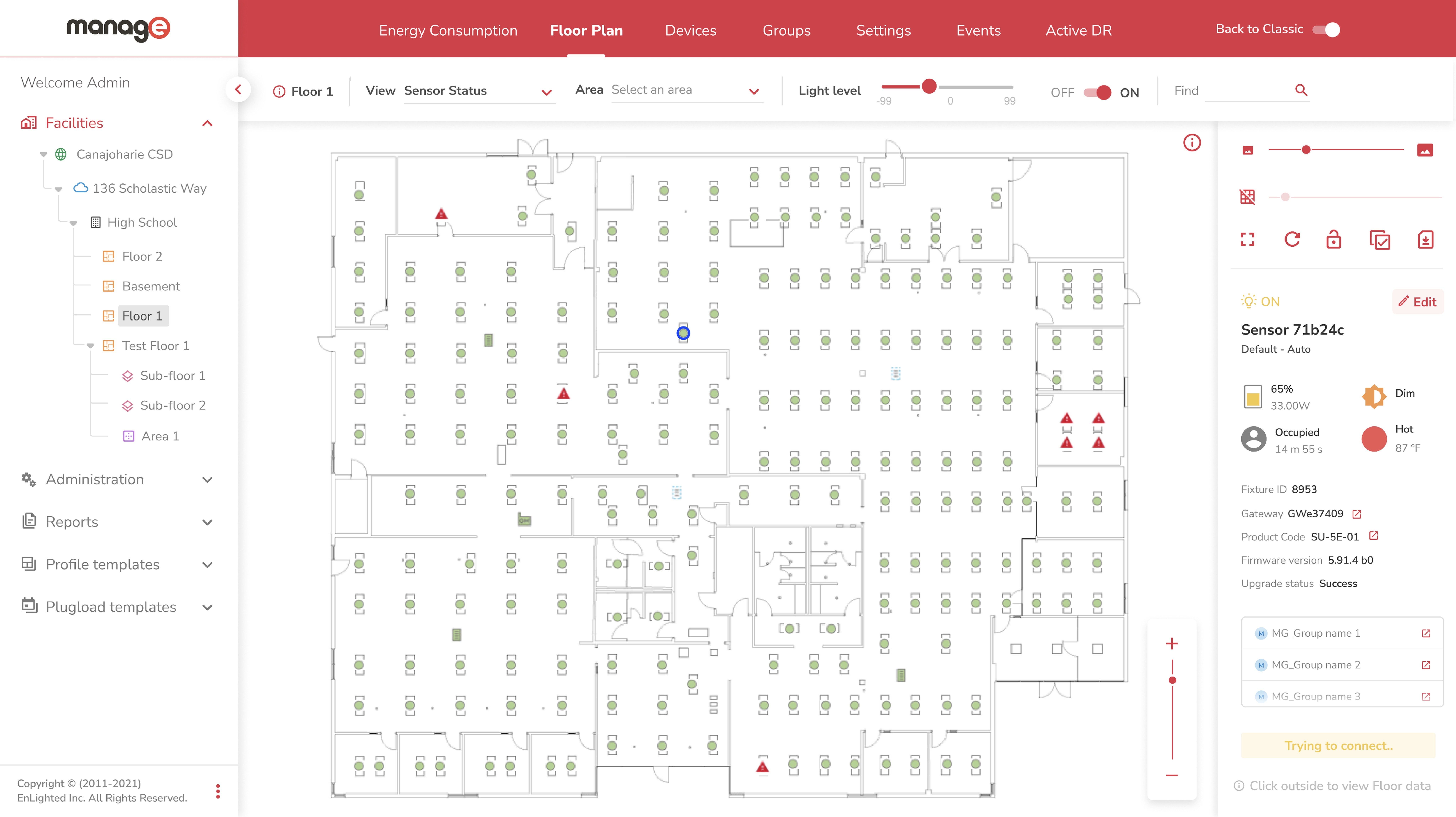 Manage (acquired by Siemens) is an industrial-scale platform to manage lighting systems and energy consumption of a building. For Siemen's field engineers, the platform is the primary interface for bringing massive buildings "to life" at the time of construction.